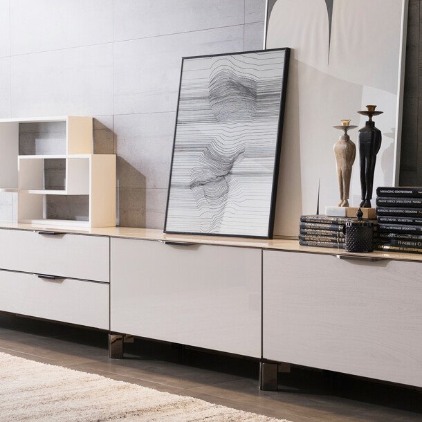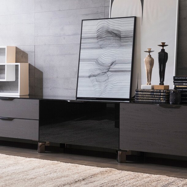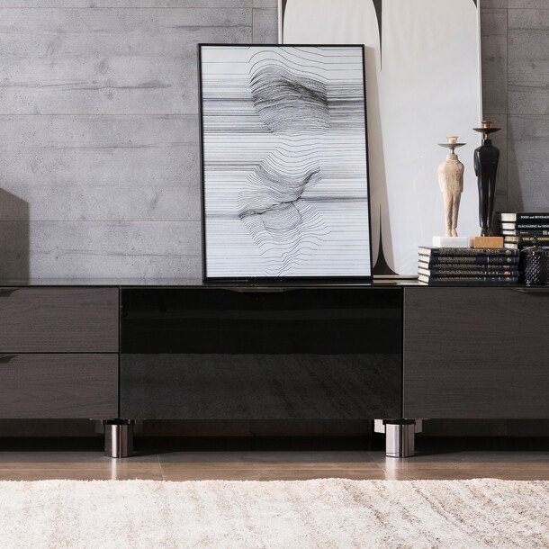 구성 노빌레 사이드장 AV (상판유리 포함) 마감소재 · 바디: 레놀릿 PP+5mm 배강도 실크 인쇄 유리(상판) · 다리: 알루미늄 흑니켈 도금