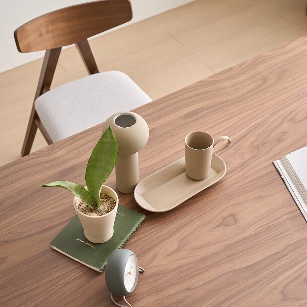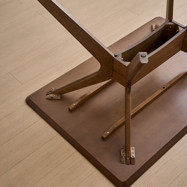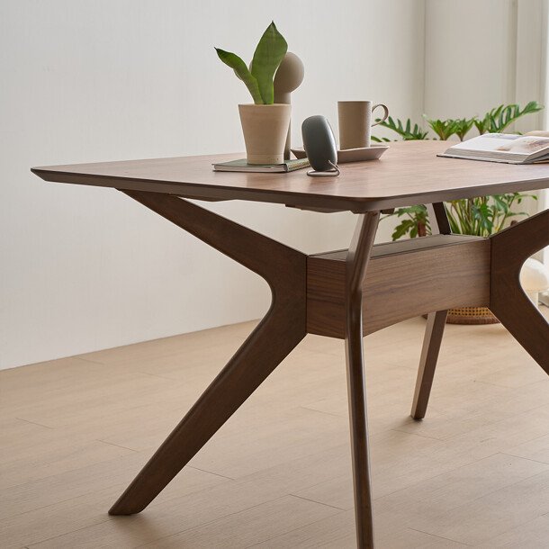 월넛 베니어 상판과 고무나무 원목 다리는 목재 특유의 아늑하고 따뜻한 분위기를 전합니다. 상판은 무광 무색의 PU 도장으로 마감하여, 나무의 자연스러운 질감 위에 오염이 잘 스며들지 않도록 하여 편리성을 높였습니다.