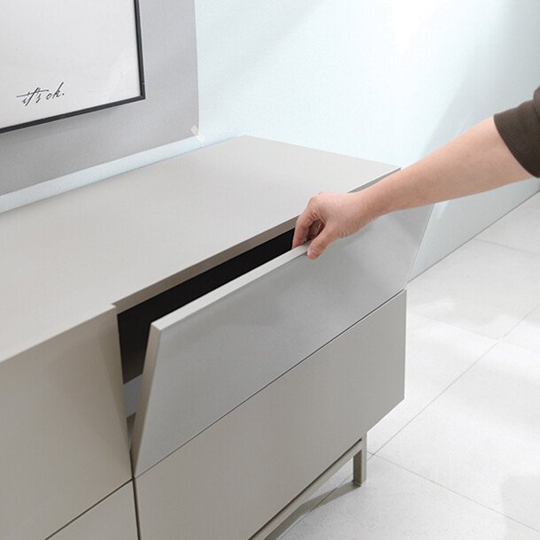 핸들리스 손잡이 : 상부 도어를 돌출하여 상판을 감싸안은 형태는 핸들리스 타입의 손잡이 역할을 합니다. 손잡이가 없어 안전하며 디자인적으로 깔끔하게 연출 됩니다. 견고한 스틸 다리 : 동일한 컬러로 마감된 스틸 다리는 중앙장의 포인트가 될 뿐만 아니라 견고하게 연결되어 튼튼하게 사용할 수 있습니다.