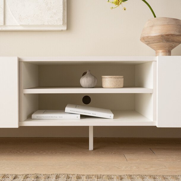 군더더기 없는 깔끔한 서랍장 속에 다양한 물건들을 보관해 보세요. 중앙 선반 뒤쪽에는 전선홀이 있어 AV기기를 심플하게 수납할 수 있습니다.