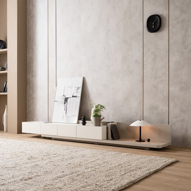 – 거실장을 이동하며 자유롭게 길이를 조절할 수 있습니다. – 길이가 변하면서 생기는 공간에 보다 많은 물건을 올려 놓을 수 있을 뿐만 아니라 새로운 분위기를 만들 수 있습니다. – 보조다리를 제거하여 가운데 뿐만 아니라 양쪽으로 확장 가능합니다.
