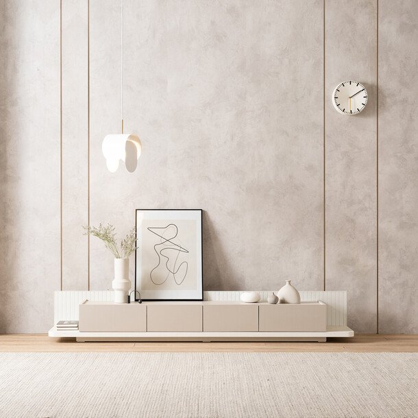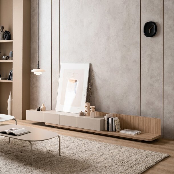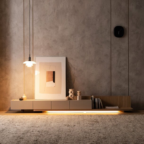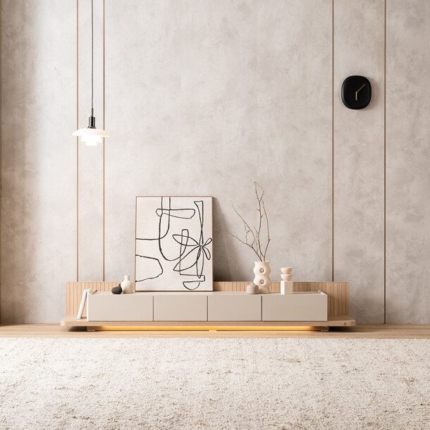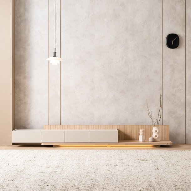 디바인은 원목의 내추럴 질감이 느껴지는 템바보드 아트월에 슬림하고 모던한 거실장을 더한 레이어드 스타일의 거실장입니다. 서로 다른 소재의 질감이 대비되면서도 자연스럽게 어우러져서 시선을 집중시키죠. 거기에 무드를 더하는 조명까지 켜주면 디바인 하나로 거실 인테리어 완성. 우리 집 거실을 변화무쌍하게 변화시킬 하나의 거실장, 디바인입니다.